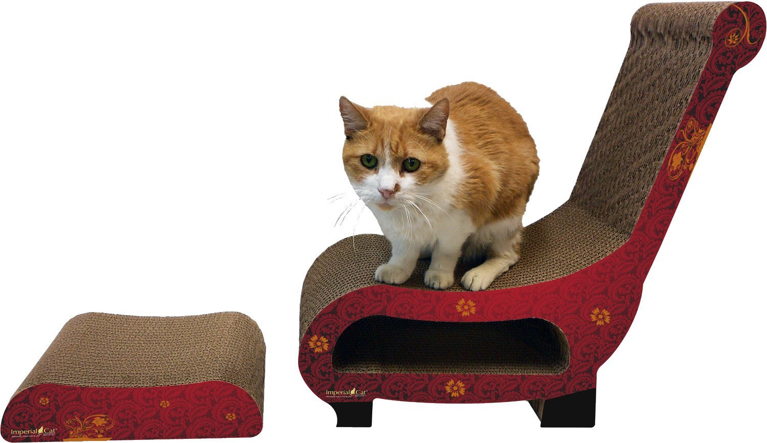 Measuring 18.5 x 9 x 22.2 inches and 2.2 pounds. This scratcher mimic's your favorite chair and helps your feline companion leave your fine upholstery alone. With many angles to scratch your cat will not bother with your furniture anymore. The inner cavity is removable and acts as a ottoman. Made of heavy duty cardboard this scratcher will not cave and nor will it wear out in a short amount of time.